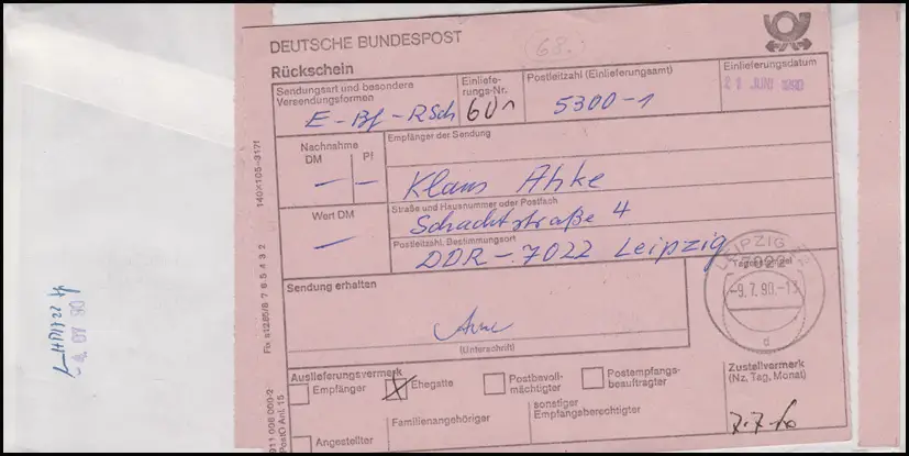 nach Leipzig / Ankunftsstempel auf dem Rückschein 9.7.90, Rückschein beiliegend