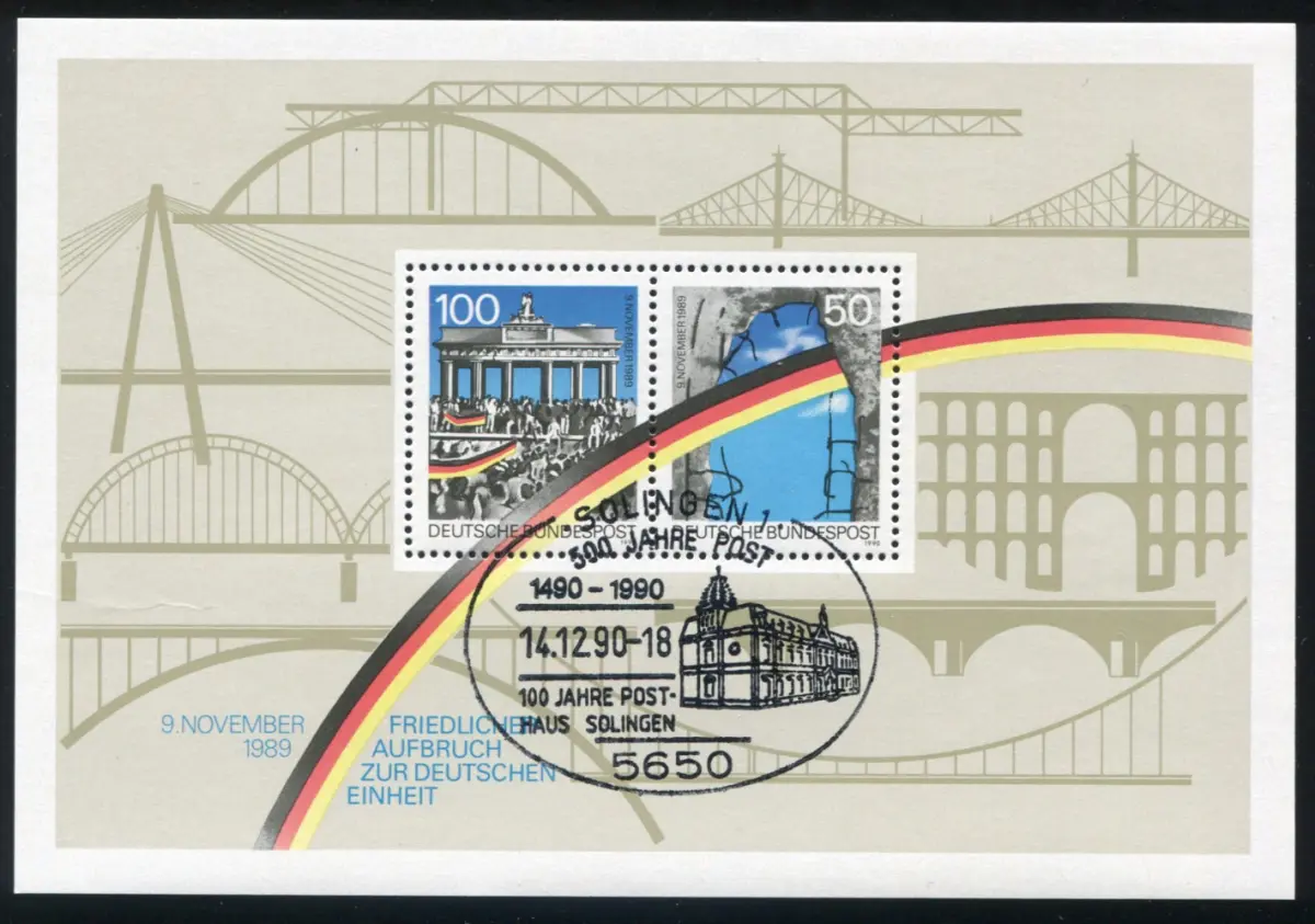 MICHEL-Plattenfehler I: Punkte im C von DEUTSCHE im 100-Pfennig-Wert (1482), Sonderstempel "SOLINGEN 500 Jahre Post - 100 Jahre Posthaus Solingen 14.12.90"
