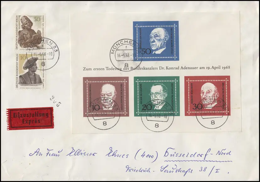 Block 4 Konrad Adenauer MiF mit Berlin Eil-Brief MÜNCHEN 16.5.68 nach Düsseldorf