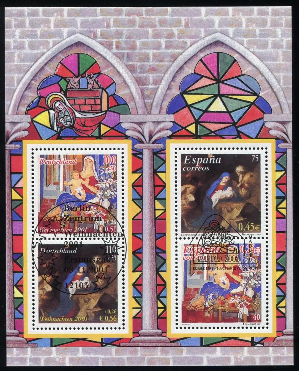 Plattenfehler schwarzer Fleck über den Füßen von Maria im Blockrand bei der 100-Pfennig-Marke, Ersttagssonderstempel BERLIN 8.11.2001