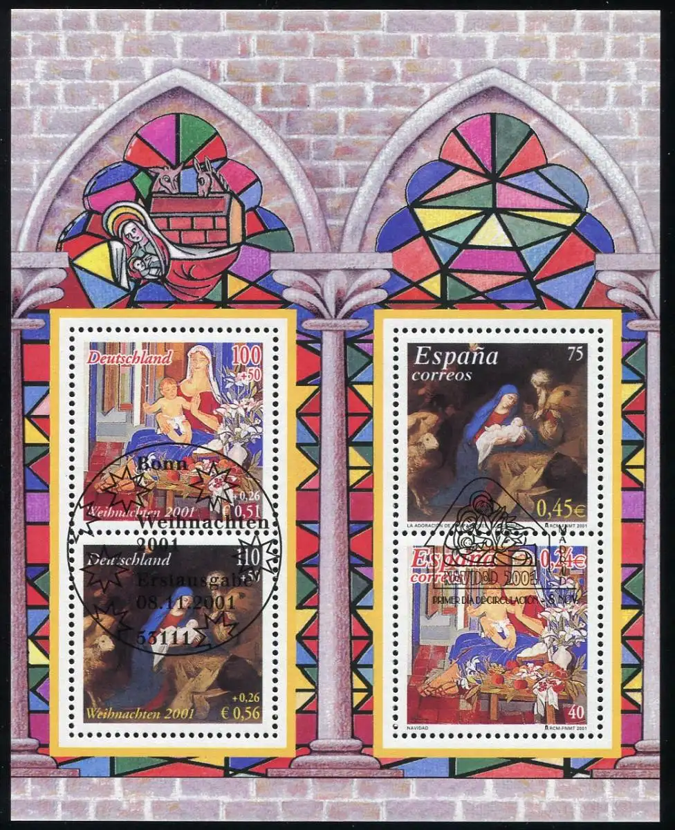 Plattenfehler schwarzer Fleck über den Füßen von Maria im Blockrand bei der 100-Pfennig-Marke, Ersttagssonderstempel BONN 8.11.2001