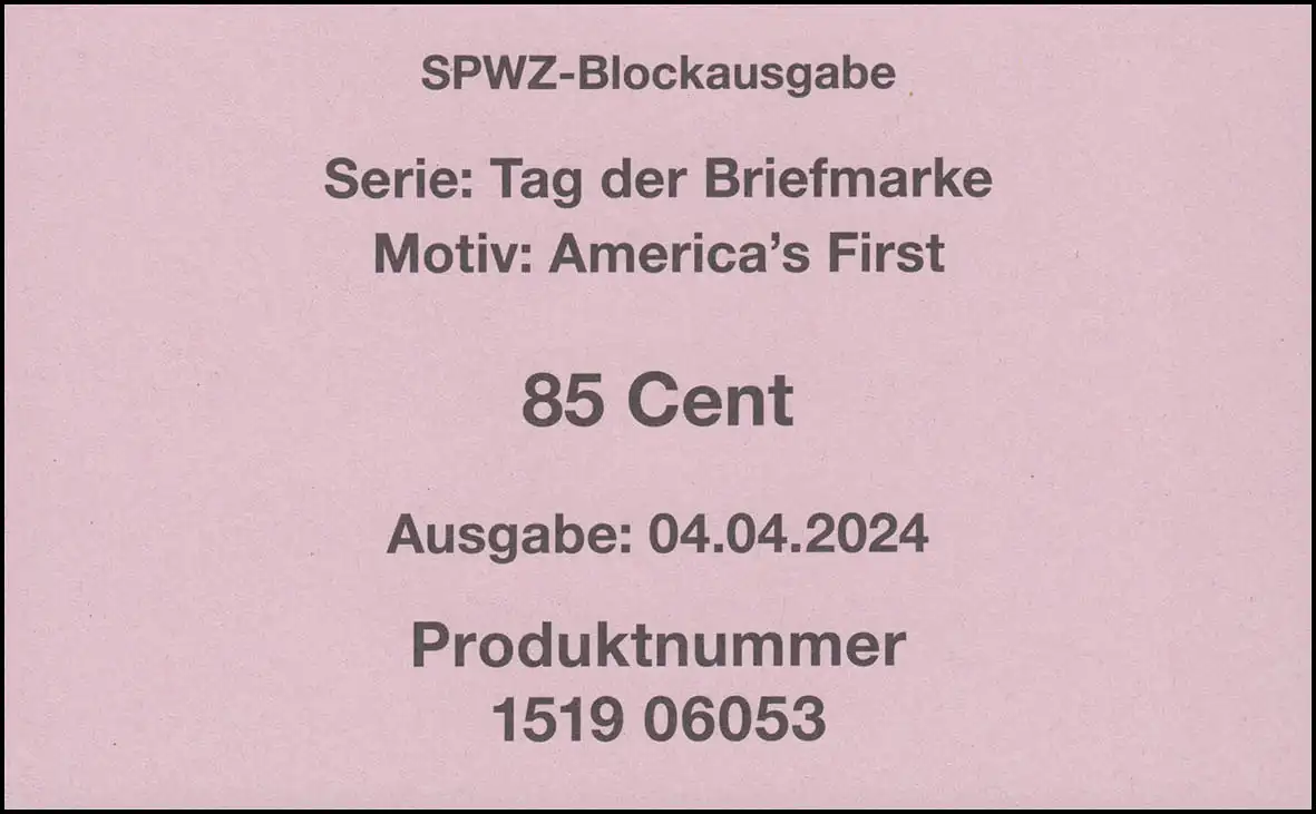 Block 93 America´s First, Ochsenaugen, Beipackzettel der Blockausgabe