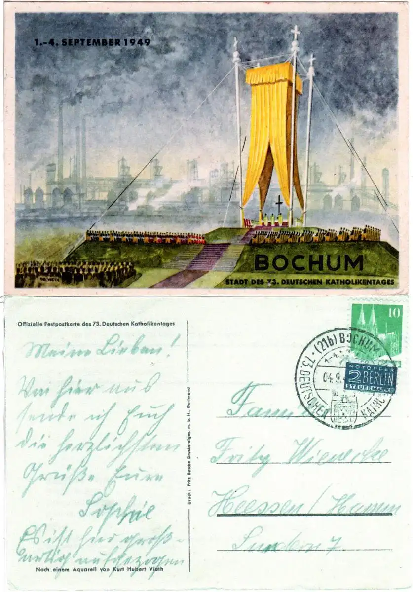 Schöne Karte v. Sept. 1949 m. 10 Pf. u. Sonderstempel (21b) Bochum 73. Deutscher Katholikentag