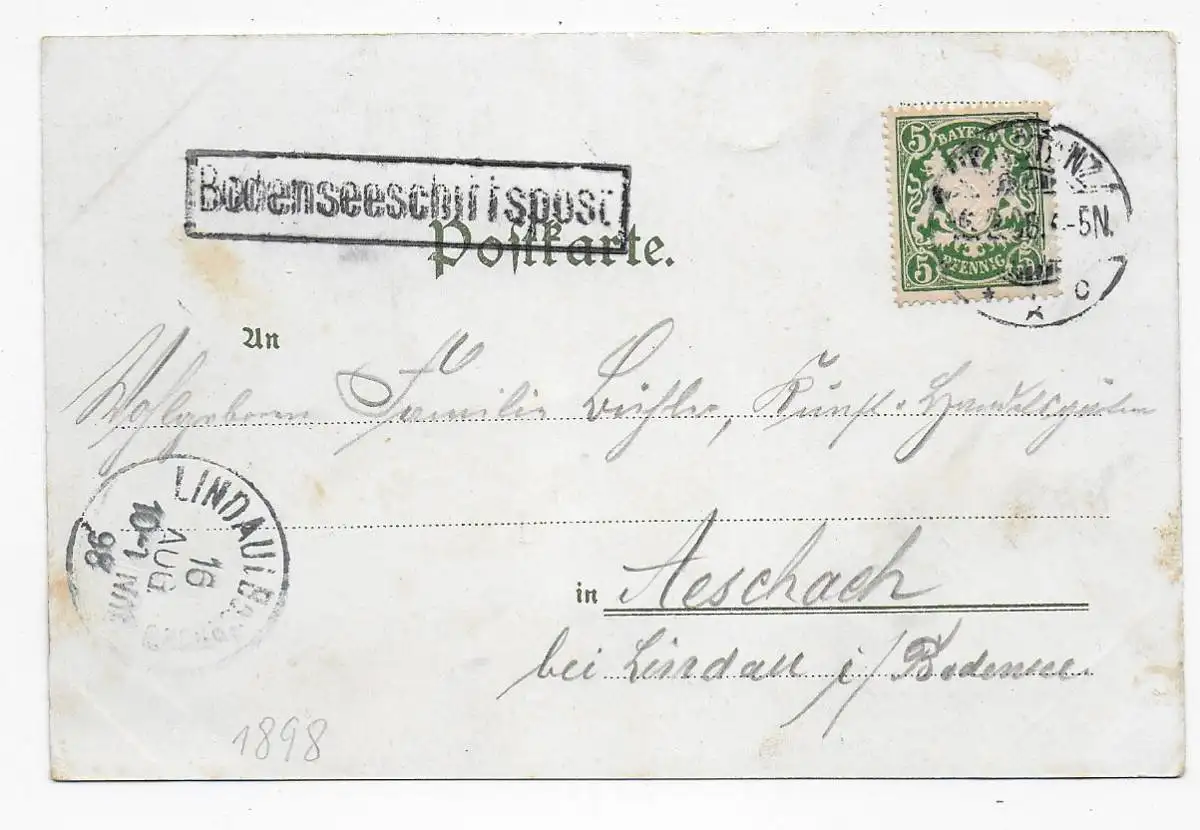 Bodenseeschiffspost - Ansichtskarte Konstanz 1898 nach Aeschach