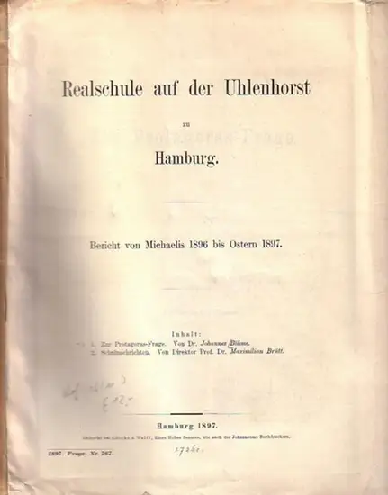 Böhme, Johannes: Zur Protagoras-Frage. Beilage zum Bericht über das Schuljahr von Michaelis 1896 bis Ostern 1897 der Realschule auf der Uhlenhorst zu Hamburg. Programm Nummer 767.