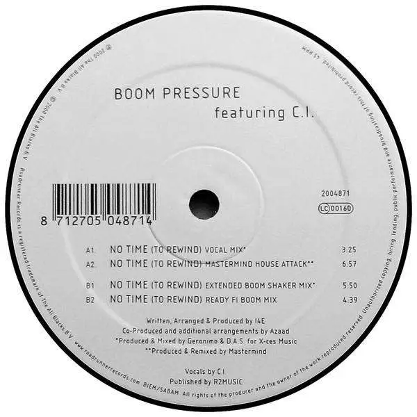 12" Maxi Boom Pressure feat. C.I. - No Time To Rewind, neutrales Cover, Zustand Platte M- Hülle M-; Made in Europe 2000 CNR Records 2004871, Tracks Vocal Mix 3:25, Mastermind House Attack 6:57, Extended Boom Shaker Mix 5:50, Ready Fi Boom Mix 4:39