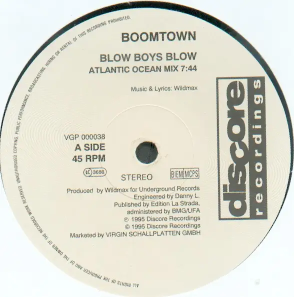 12" Maxi Boomtown - Blow Boys Blow, Einheitscover der Plattenfirma, Zustand Platte M- Hülle M-; Made in Germany 1995 Discore Recordings VGP 000038, Tracks Atlantic Ocean Mix 7:44, Pacific Ocean Mix 7:35