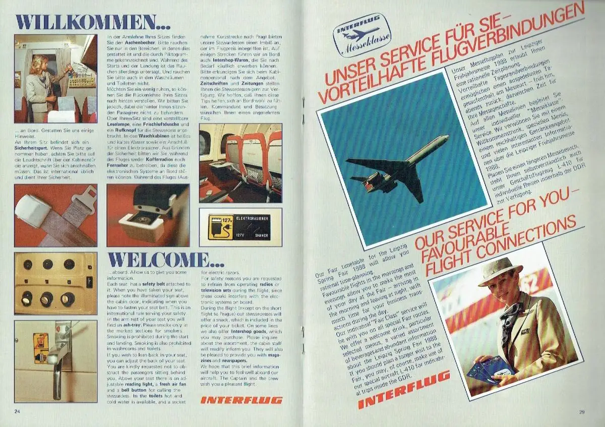 sehr guter Zustand, geringe Gebrauchs- und Alterungsspuren: die Streckenkarte (Seite 25-28) liegt lose bei - Umschlagfalz teils etwas beschabt, Kontakt mit aller Welt — Flughafen Berlin-Schönefeld In contact with the whole world — Berlin-Schoenefeld airport - Informationen für Passagiere Information for passengers - Wo die Drachen zu Hause sind Where the dragons are at home - In Gottfried Sempers Oper erklingt wieder Musik The sound of music has come back to Gottfried Semper's opera house - Insel der Museen Island of museums - Stets für Sie bereit Always at your call - Im Einsatz auf unseren Fluglinien In operation an our routes - Willkommen ... Welcome ... - Lambrecht & Lambrecht Zwillinge im Cockpit Lambrecht & Lambrecht Twins in the cockpit - Die Golflinie The Gulf Line - Im Zeichen der Gastlichkeit In the Spirit of hospitality - Eine beschauliche Harzreise A contempiative journey to the Harz - Die Meistermacherin The trainer of champions - Ankommen bei Goethe Destination Goethe - Informations- und Buchungsbüros der INTERFLUG sowie Agenturen - Information and Booking Offices and agencies, kartoniert, ca. 20 x 28,5, 52 Seiten mit zahlreichen Bildern