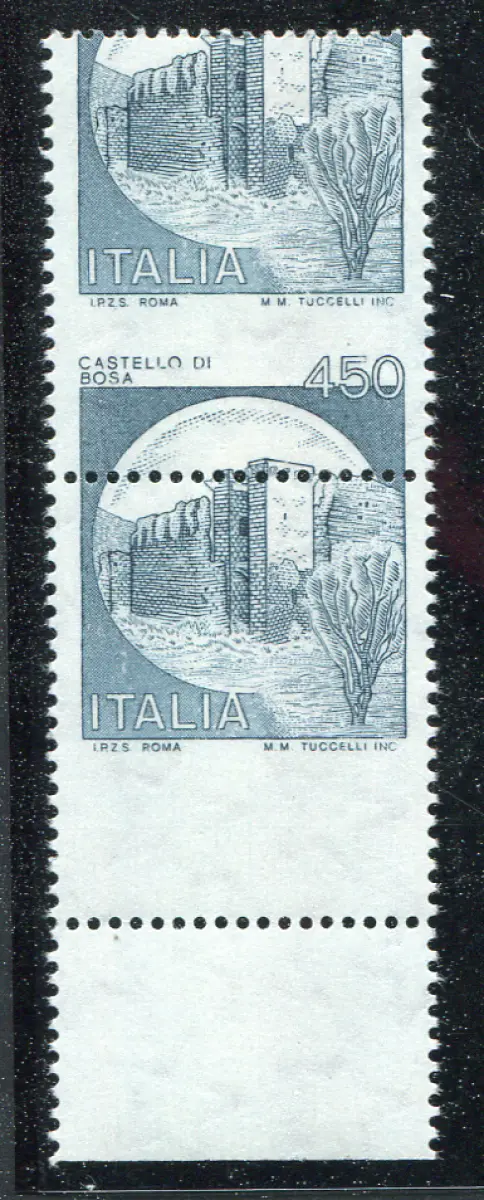 MNH Vollgummi - Castelli Lire 450 vertikales Paar nur aus Schiefer gedruckt, Sorte der Bolaffi Naturstempel - Das untere Exemplar hat aufgrund der Verzahnungsverschiebung keinen Nennwert - Neuer perfekter Vollgummi - Selten - Hoher Katalogwert Cod. 642/WEB