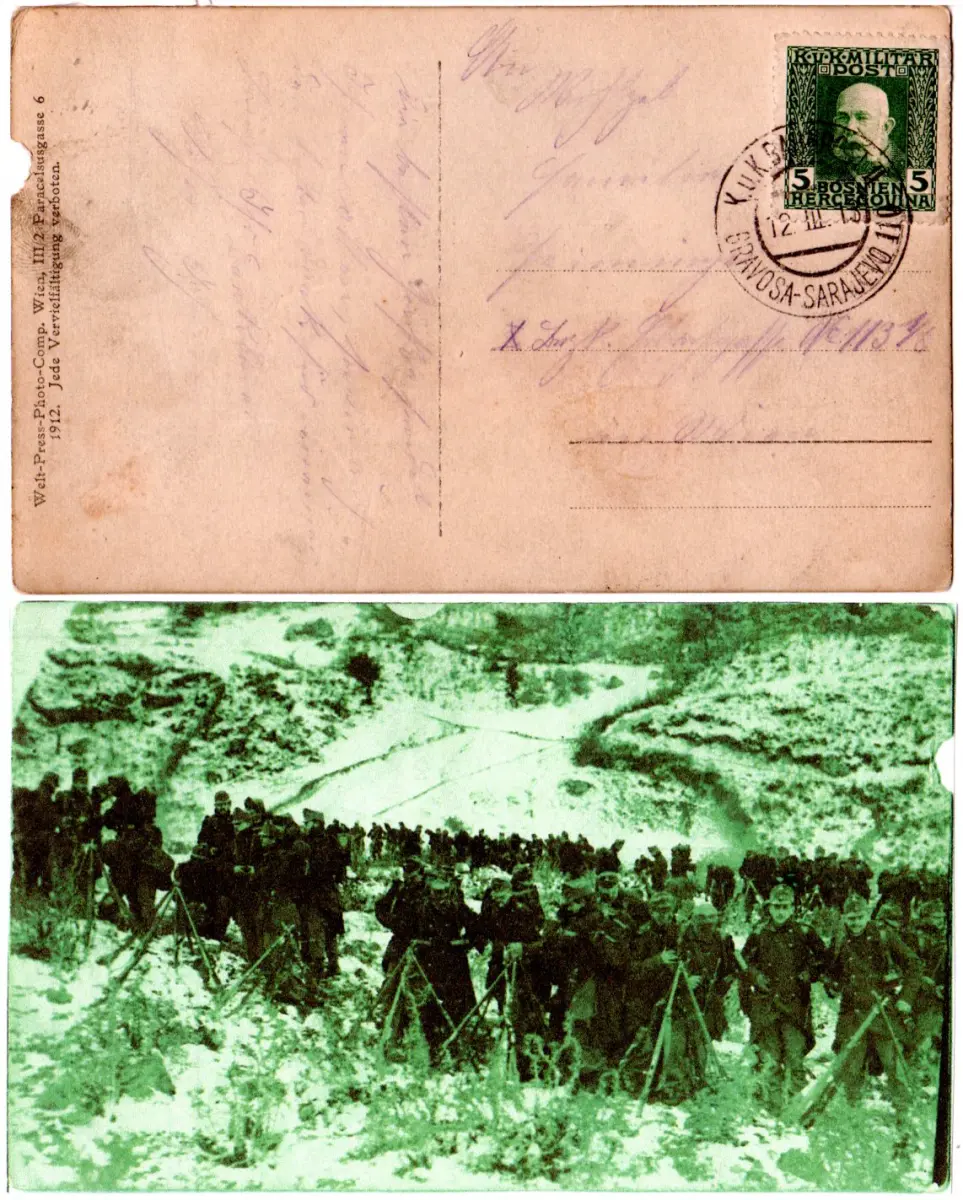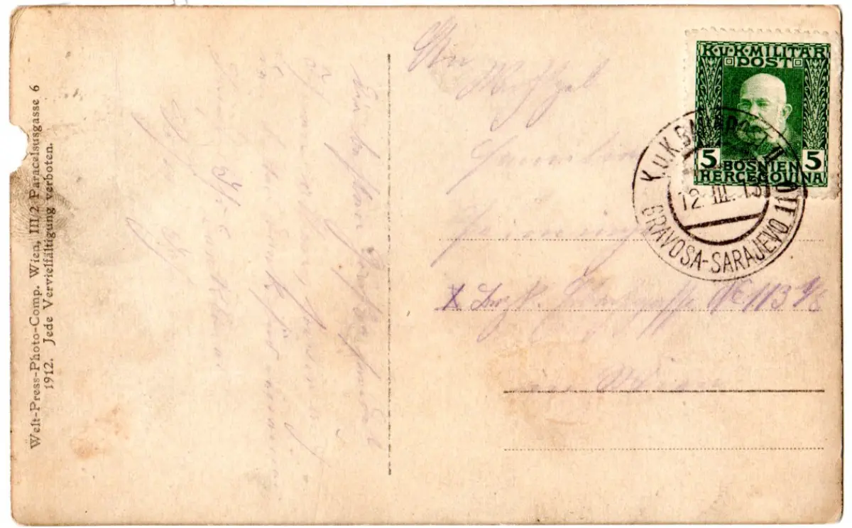 Bosnien 1913, K.u.K. Bahnpost II Gravosa-Sarajevo 110 auf AK m. 5 H.