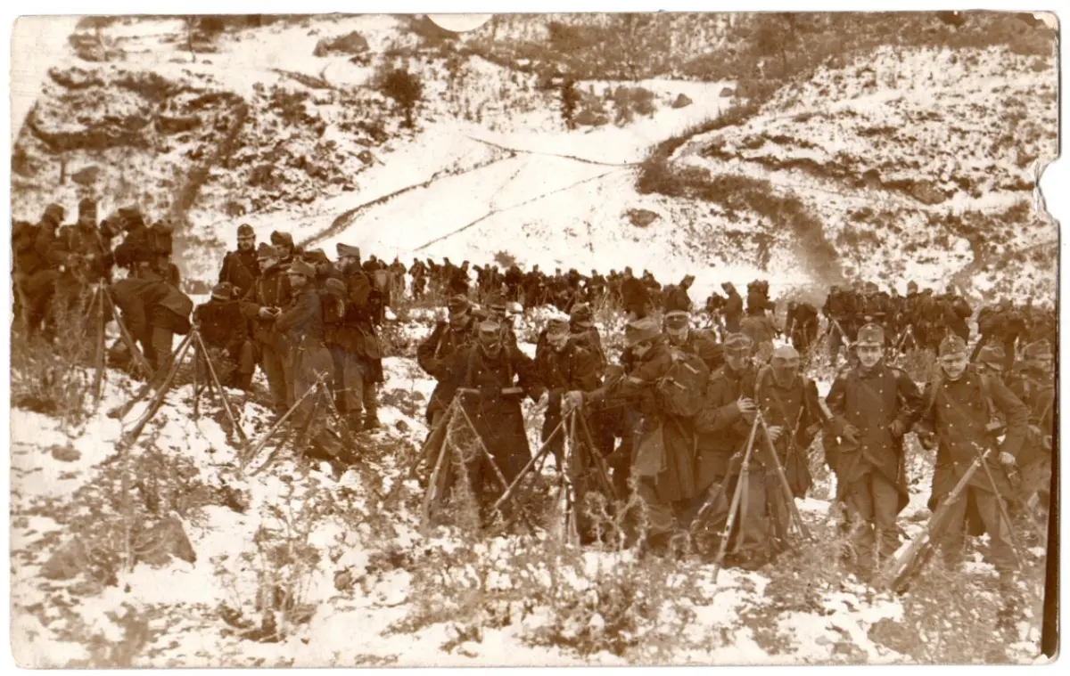 sw-Militär-Foto-AK (Fehlstelle rechts, siehe scan) m. 5 H. m. guter Bahnpost-Verwendung n. Wien.