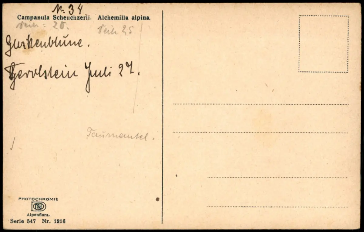 Name: Botanik Campanula Scheuchzerii. Alchemilla alpina. Photochromie Alpenflora