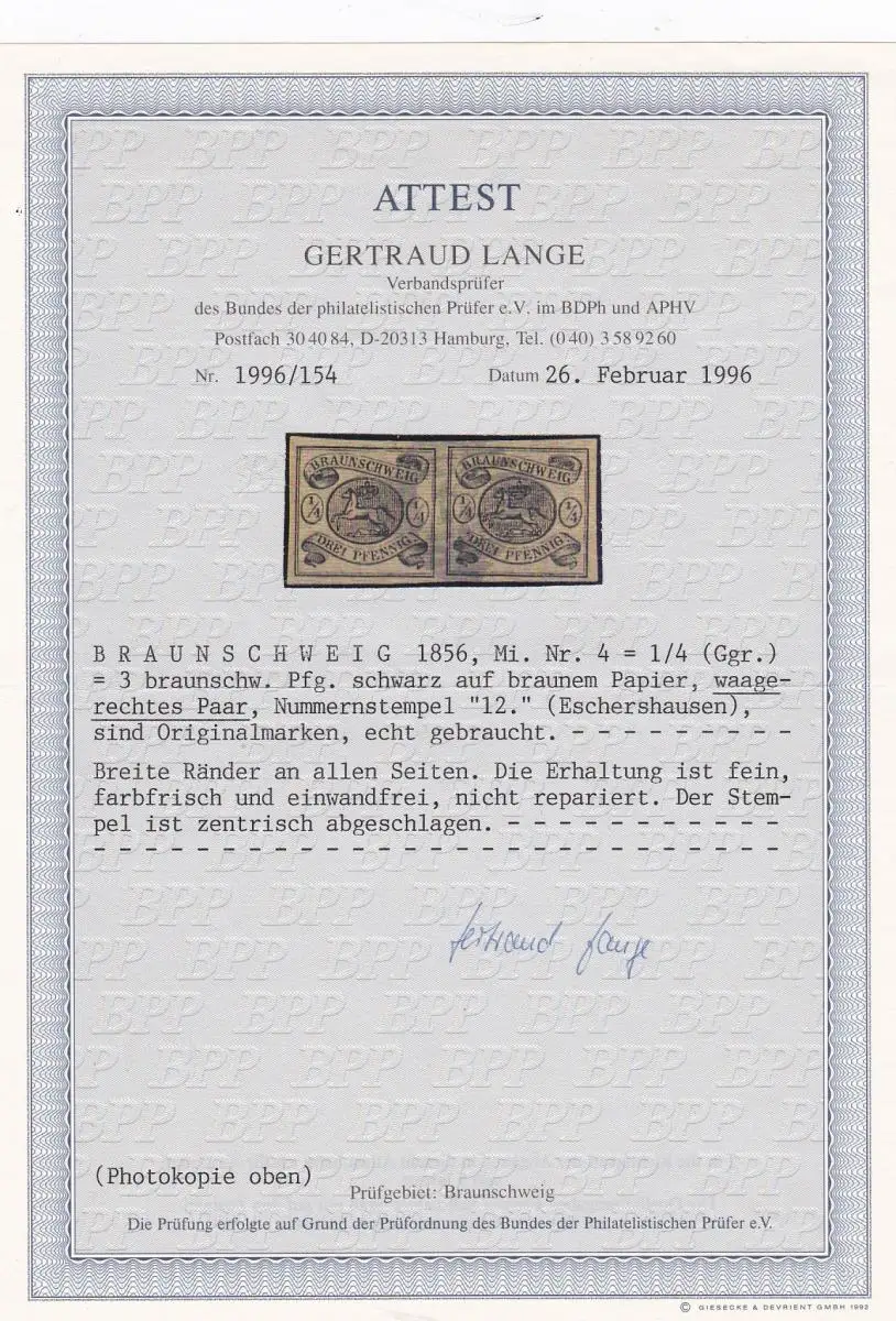 Braunschweig: MiNr. 4, waagr. Paar, gestempelt 12, Eschershausen, BPP Attest