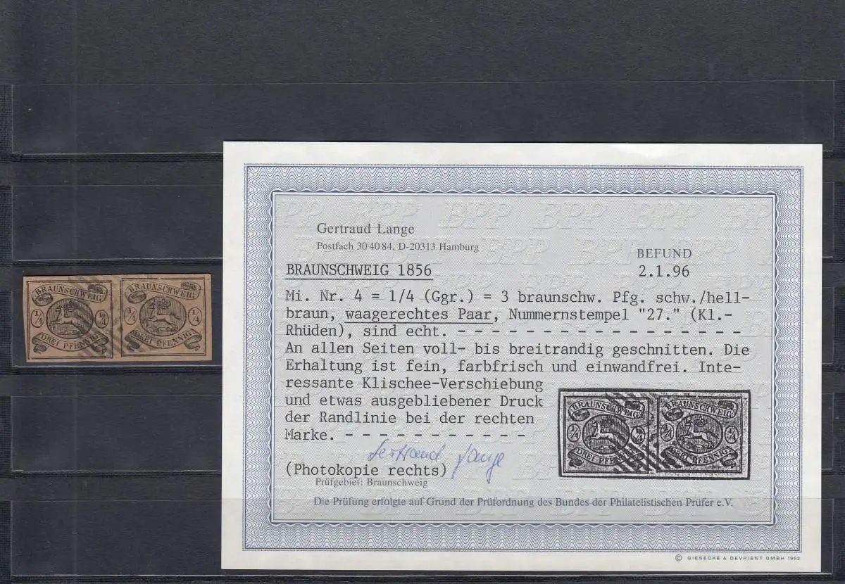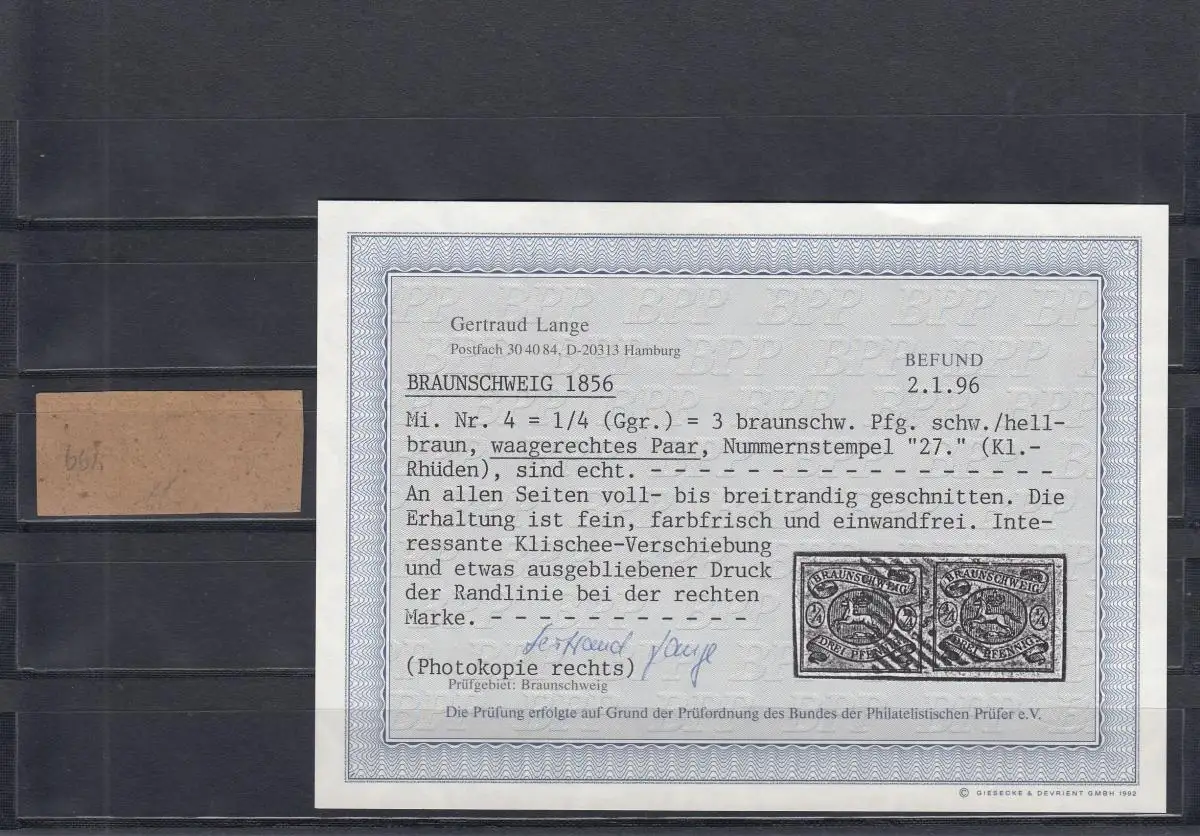 Braunschweig: MiNr.4, waagr. Paar, Stempel 27, BPP Befund, Klischee-Verschiebung