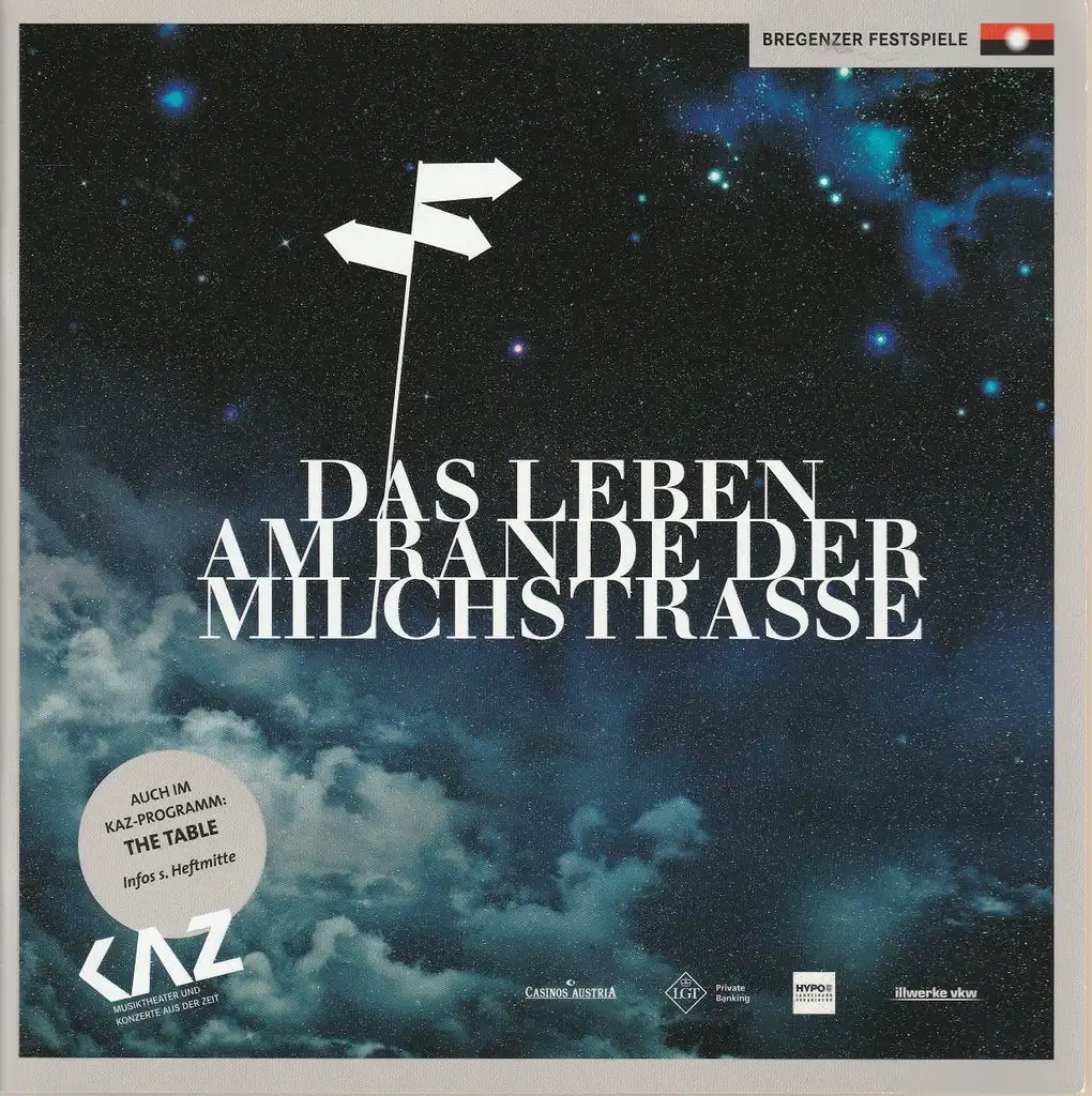 DAS LEBEN AM RANDE DER MILCHSTRASSE: Eine Sitcom-Oper in 7 Folgen / Staffel 1 / Folge 1-3. Musik: Bernhard Gander. Buch: Johannes Heide & Christa Salchner. Musikalische Leitung: Simeon Pironkoff. Inszenierung: Nicola Raab. Ausstattung: Alexandra Burgstaller. Mitwirkende: Benjamin Appl, Nicholas Isherwood, Theresa Dlouhy, u. a. TRANS-MAGHREBLibretto von Hans Platzgumer. Musik: Peter Herbert. Musikalische Leitung: Benjamin Lack. Inszenierung: Ran Arthur Braun. Bühne: Susanna Boehm. Kostüme: Claudia Raab. Mitwirkende: Robert Maszl, Wilfried Staber, Amal Murkus, Stanislav Kuflyuk, Markus Raab, u. a. - Theaterprogramm, Opernprogramm, Ballettprogramm, Musicalprogramm, Konzertprogramm, Theatermemorabilia, Programmhefte Sammlung, deutsche Theatergeschichte.