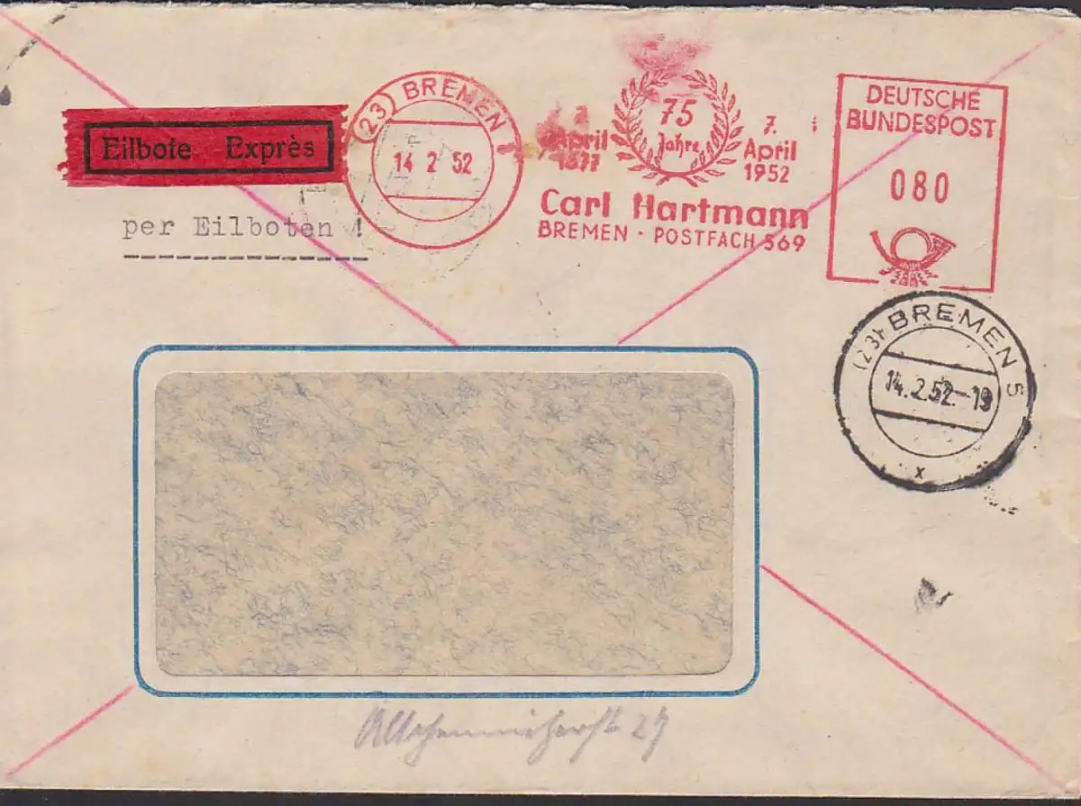 Bremen AFS Carl Hartmann 75 Jahre 14.2.52, Eilsendung nach Chemnitz