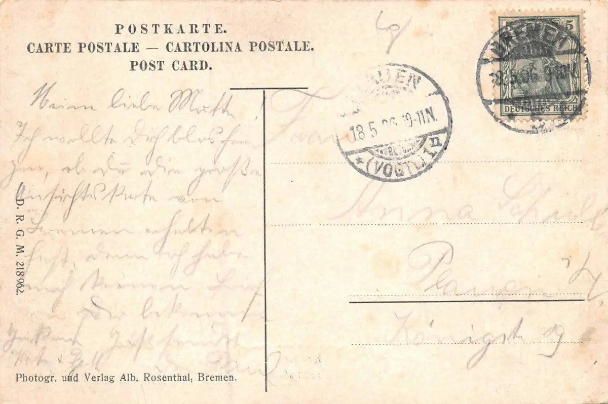 Rückseite: gelaufen 1906 von Bremen nach Plauen (Vogtl.)