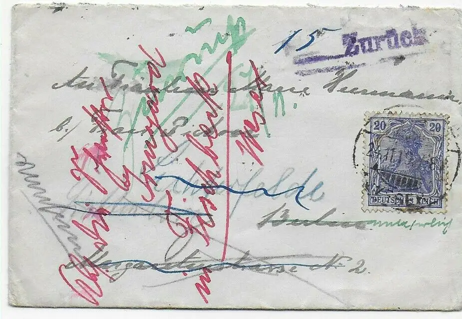 Brief 1919 nach Berlin und zurück: Öffnung zur Ermittlung Absender Berlin