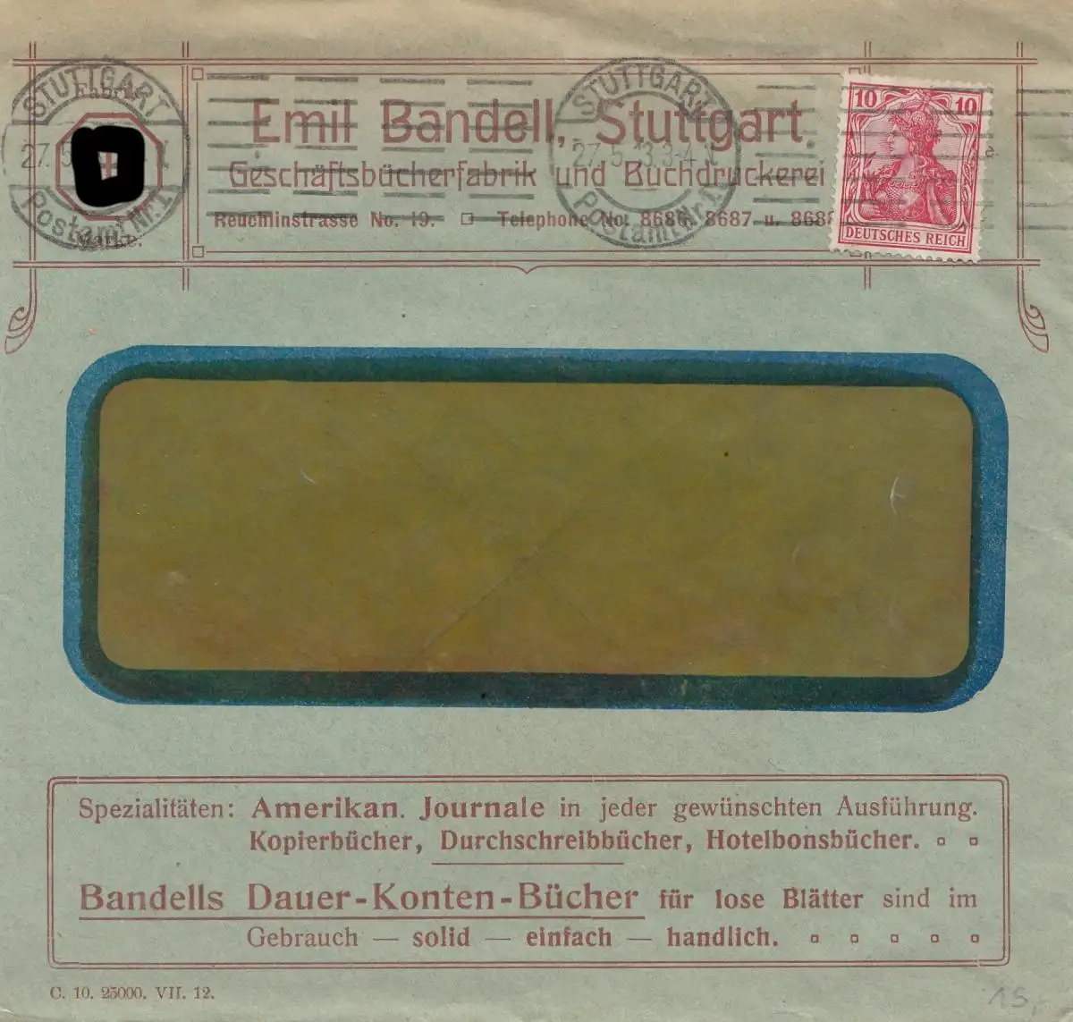 Brief Bandell, Stuttgart 1913- Indisches Glückzeichen Germania - Geschäftsbücher