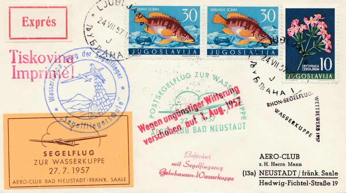 Brief Jugoslavien - Postsegelflug 1957- wegen Wetter verschoben nach Neustadt