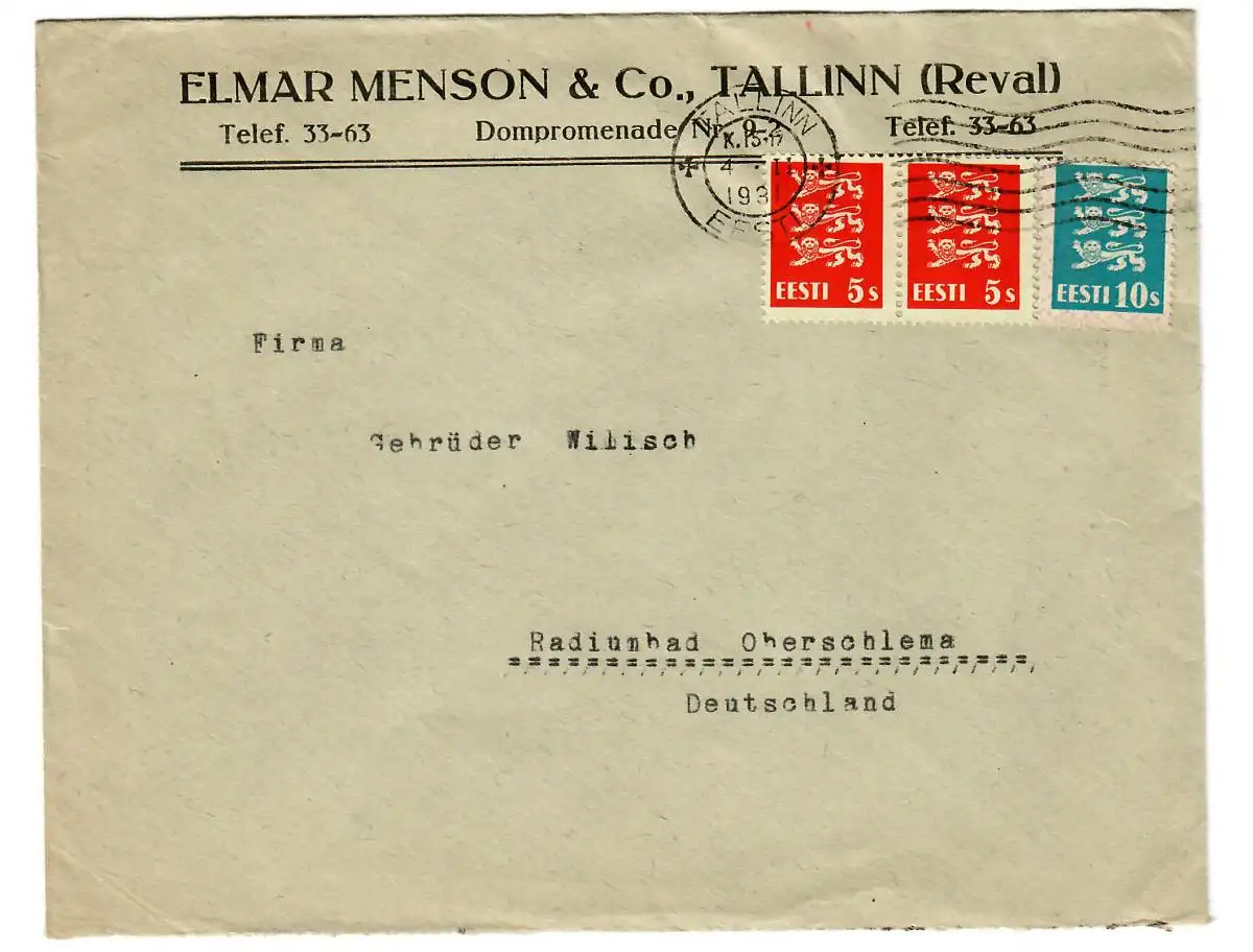 Brief aus TAllinn 1931 nach Radiumbad Oberschlema