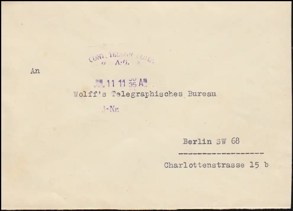 Ankunftsstempel als Stechuhr-Stempel: CONT. TELEGR. COMP. A.-G. JUL 11 - 11.35 AM. J-Nr.