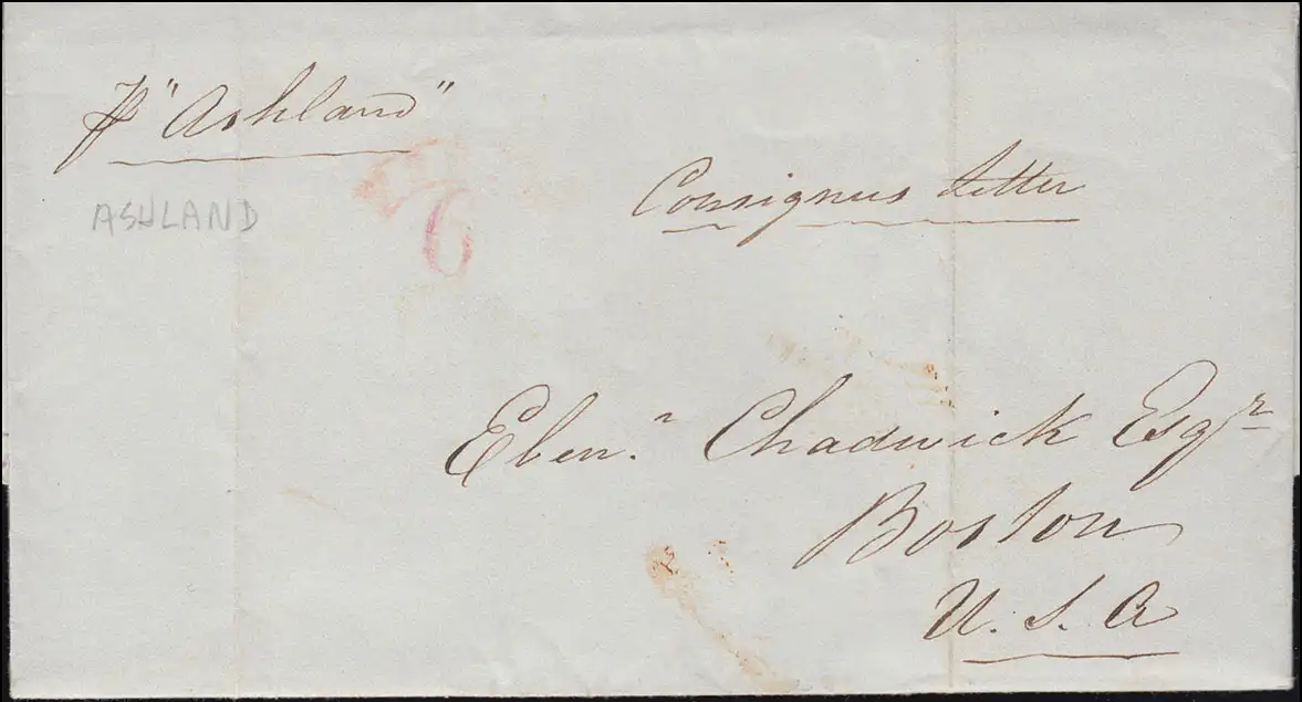 Brief vom 11.7.1844 ab Liverpool nach Bosten roter Stempel SHIP 6 (Teilabdruck)