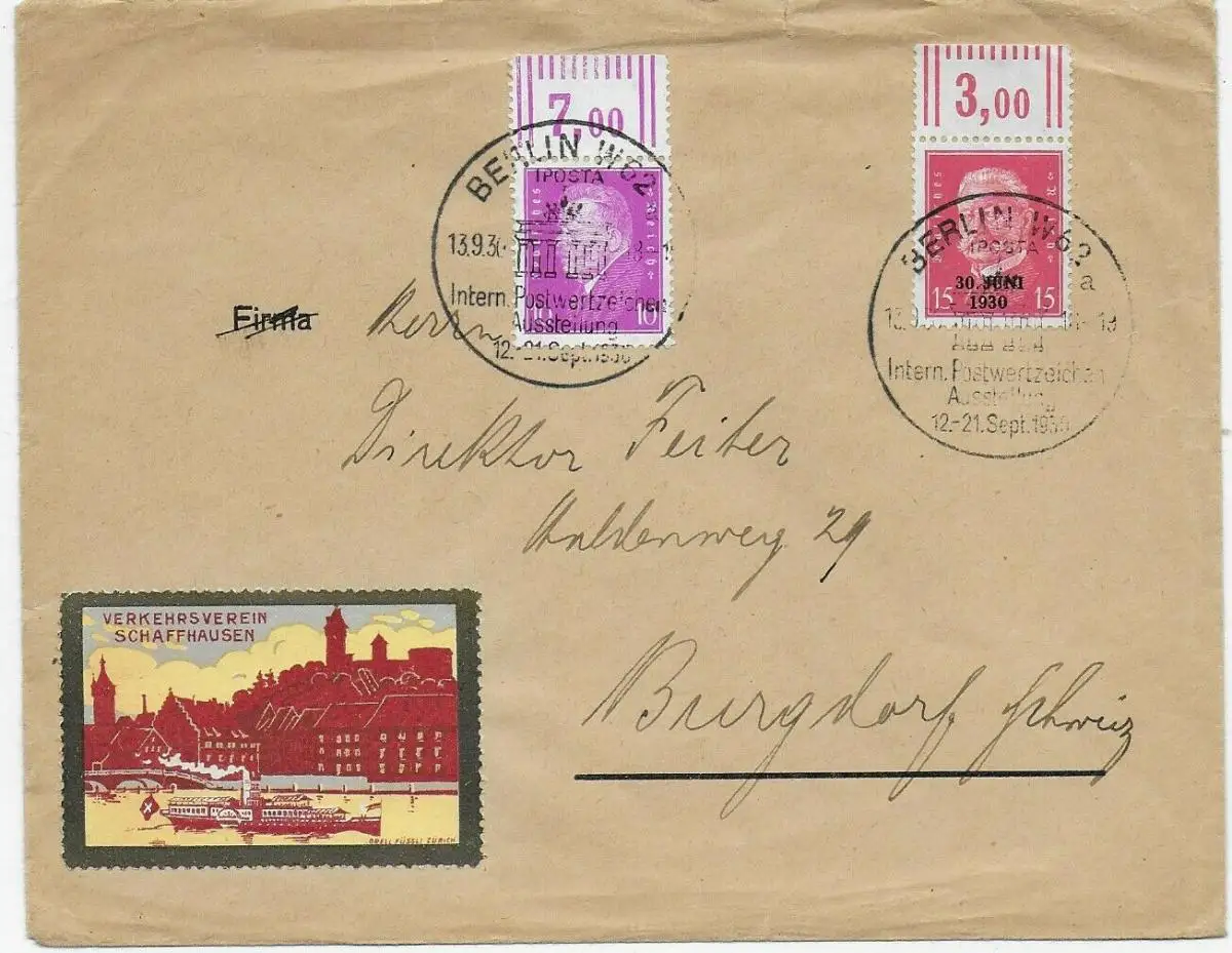 Brief von Berlin: Postwertzeichen Ausstellung 1930, Vignette Schaffhausen