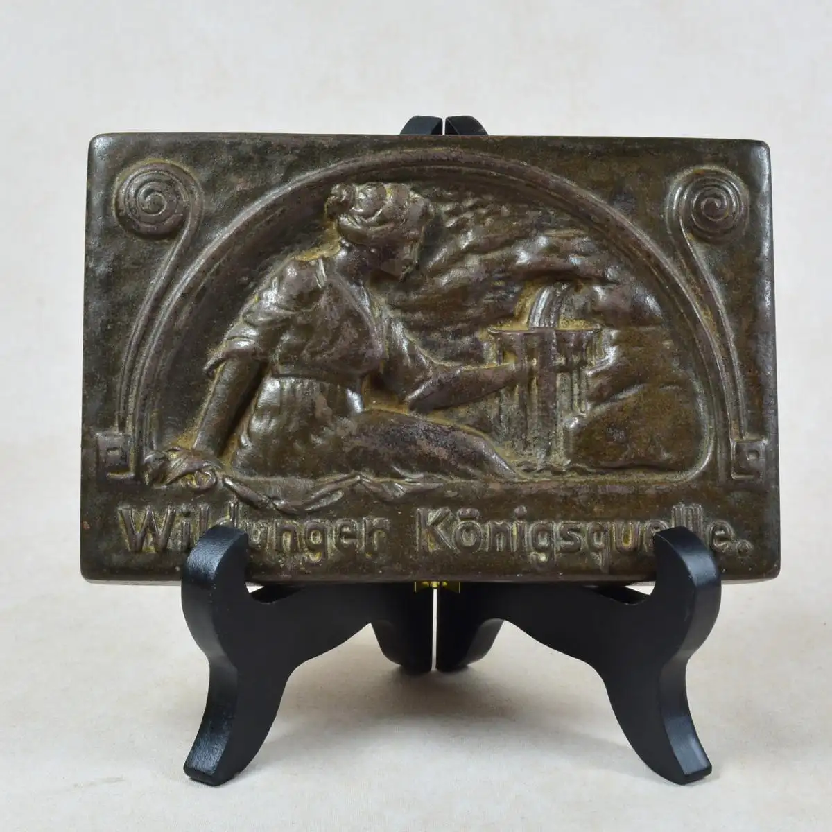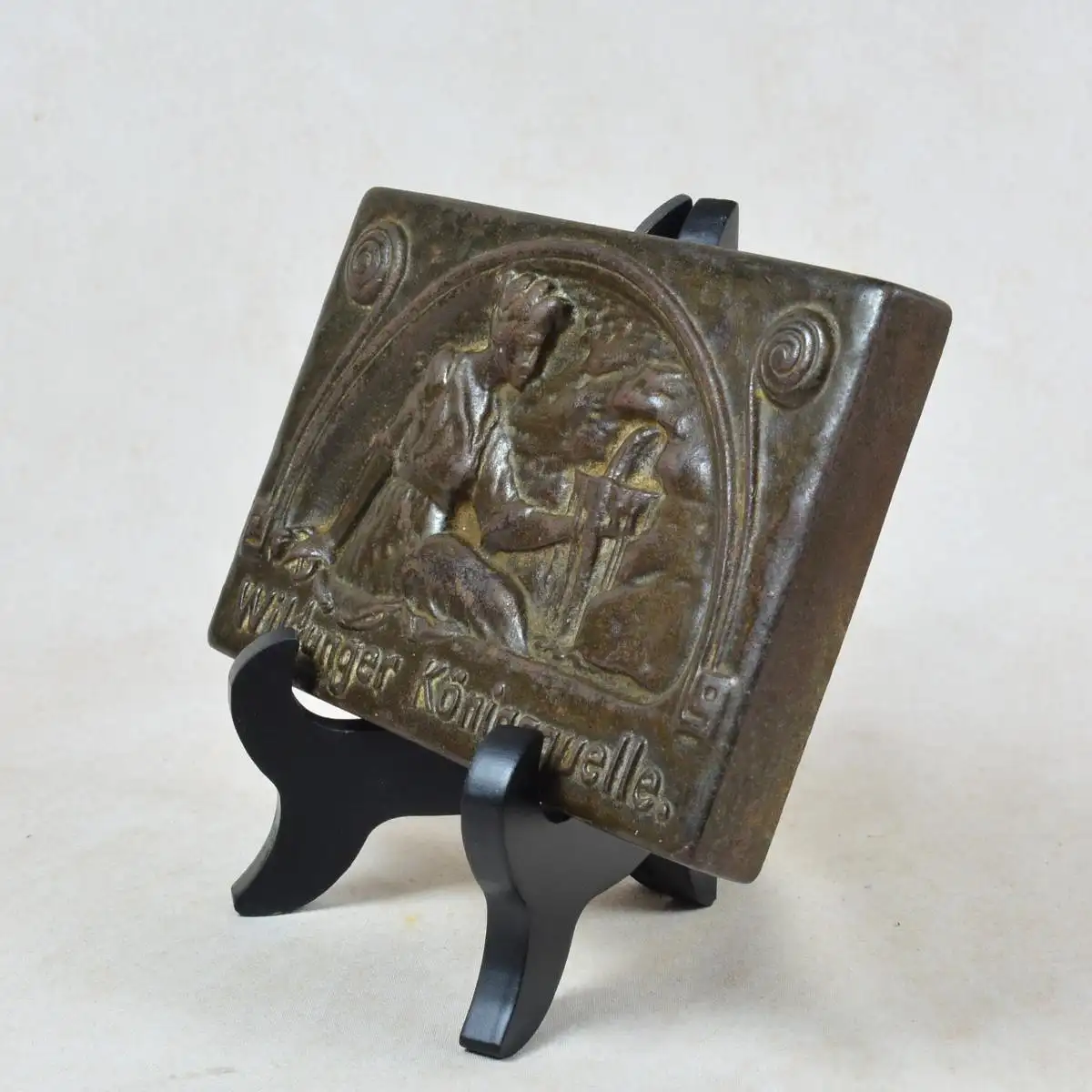 Jugendstil-Briefbeschwerer aus Lauchhammer, ca. 1900, aus einseitigem Gusseisen mit Gipsfüllung. Mit Inschrift „Wildunger Königsquelle“ und Design einer Frau, die in einer Halbkreisnische sitzt und eine Schale unter fließendem Wasser hält. Starke Patina. Sehr guter Zustand. Ideal für Sammler von Jugendstil-Objekten oder als dekorativer Akzent.