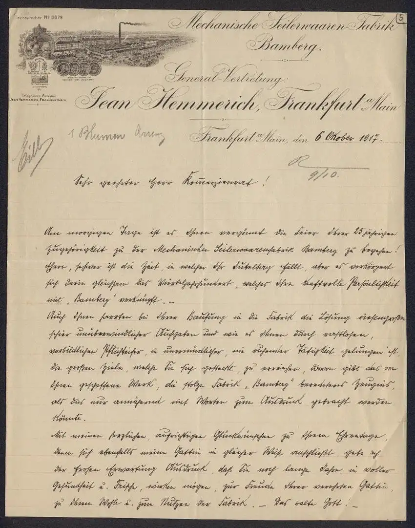 Briefkopf Frankfurt a. Main 1917, Jean Hemmerich, Mechanische Seilerwaaren-Fabrik, Die Betriebsanlage Bamberg