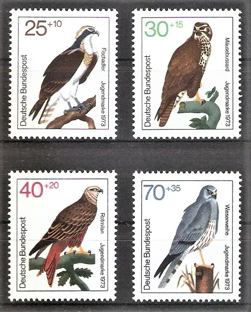 Briefmarke BRD Mi.Nr. 754-757 ** Greifvögel 1973 / Fischadler, Mäusebussard, Rotmilan, Wiesenweihe / Kompletter Satz !