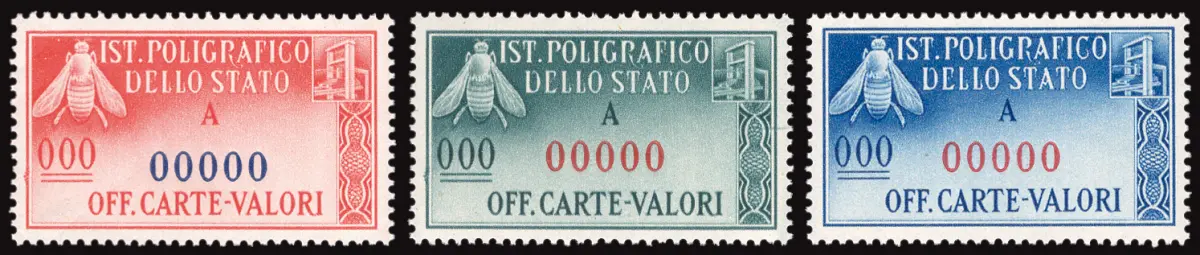 MNH - Vollgummi - Briefmarkenentwurf Ape 000 Serie mit drei Werten in den Farben Rot, Grün und Blau, tiefdruckgedruckt auf nicht filigranem Papier mit Druckaufdruck (Kat. CEI Espressi P 28A, Unified Prove Nr. 10) - Selten zusammen - Kat. euro 1.000 Cod. 974/17
