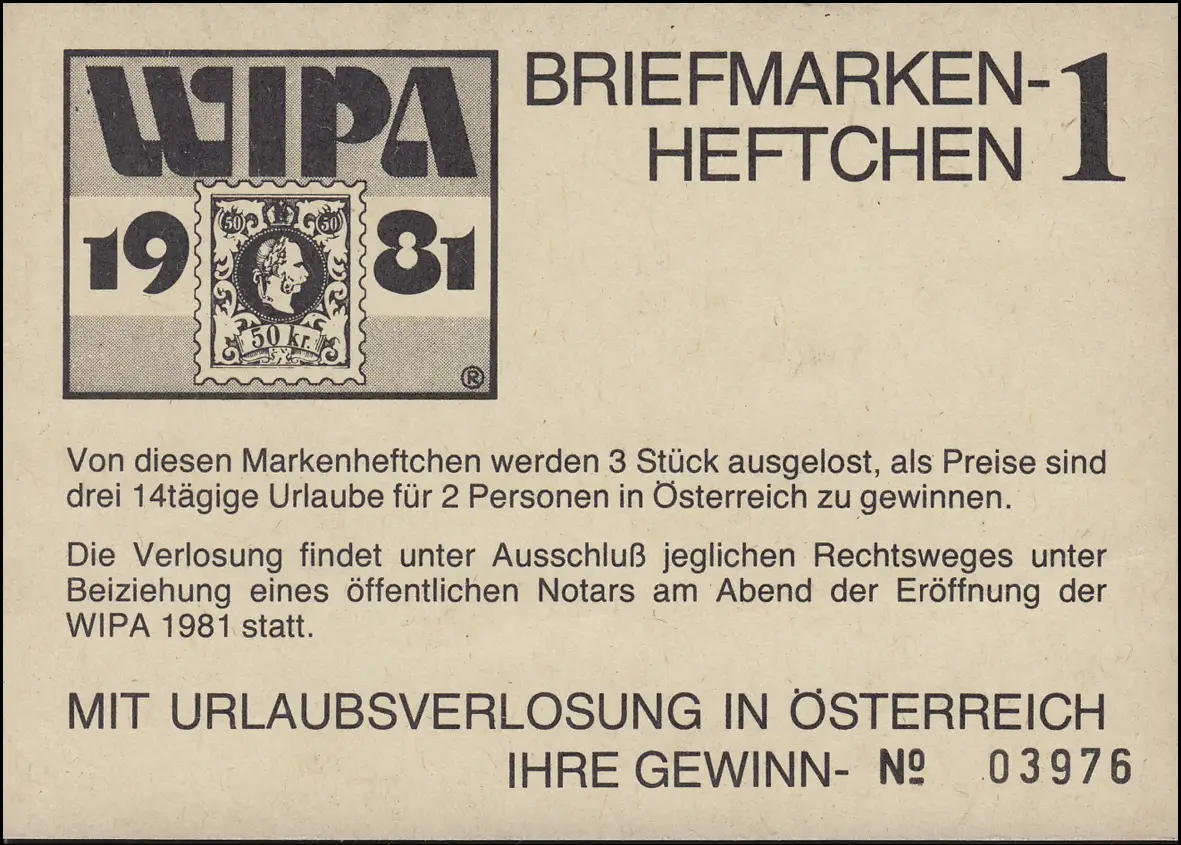 Privates Markenheftchen zur Verlosung eines Urlaubes in Österreich am Abend der Eröffnung der Weltausstellung WIPA 1981. Eingeklebter Rand-Viererblock hat Tagesstempel GRAZ-MARIATROST 12.2.97.