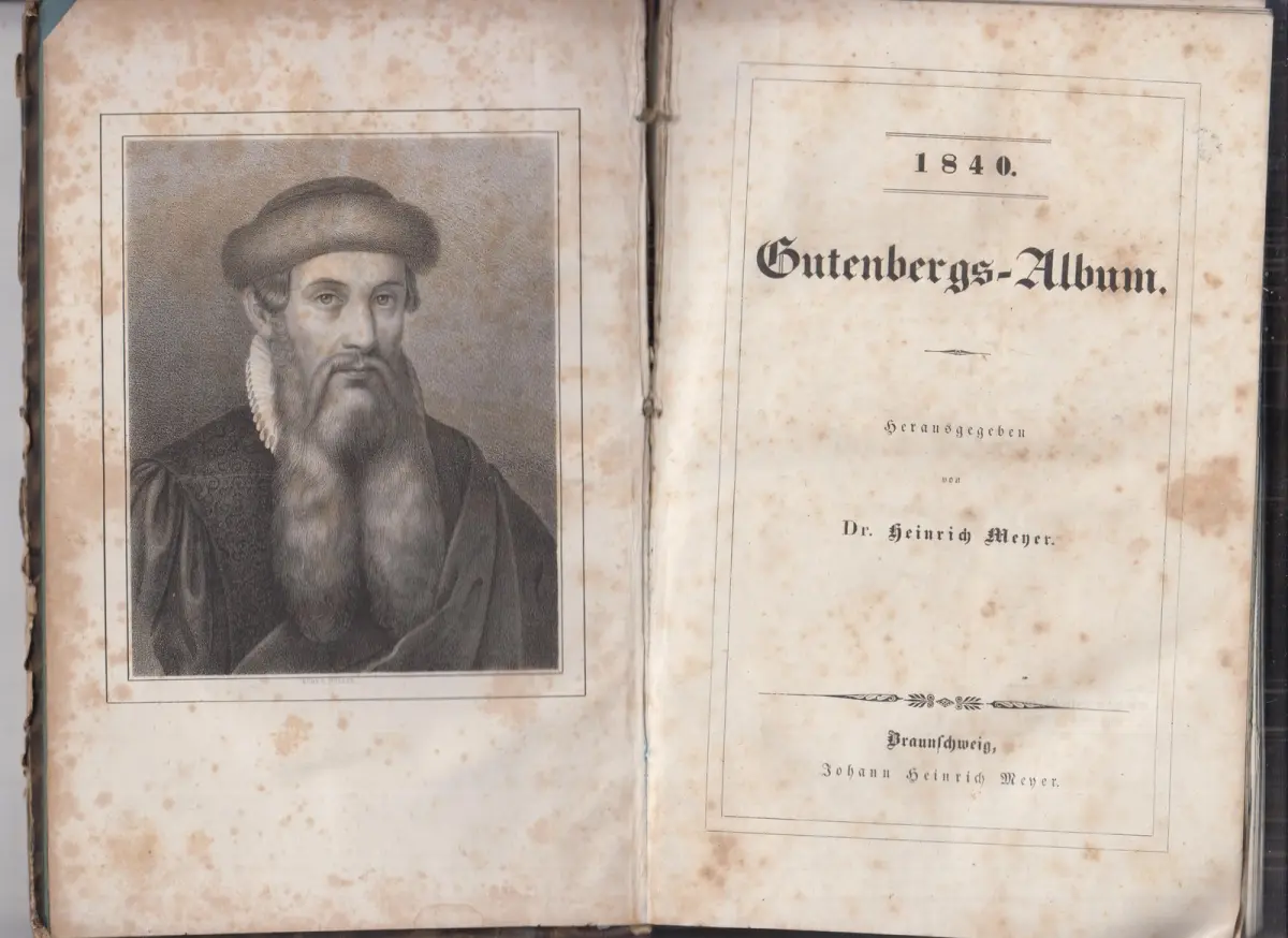Bemerkungen: Zustand: Einband stark kantenberieben, der Rücken fleckig und aufgehellt, der Rückentitel berieben, der Rücken etwas leseschief, der Buchblock durchgängig in den Rändern braunfleckig und stockig, das Frontispiz (Gutenberg-Porträt) wie das Titelblatt durchgängig braunfleckig, die Bindung am Frontispiz sichtbar // Druck in einer Fraktur, mit Schriftproben, alle Seiten mit Rahmen