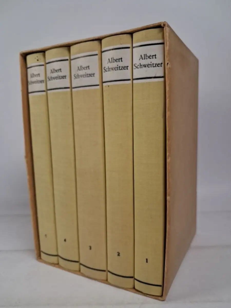 Bemerkungen: Zustand: Schuber berieben und gebräunt, Buchrücken und Papier gebräunt // Mit Frontispiz, Dünndruckausgabe. Herausgegeben von Rudolf Grabs, Vorwort von Gerald Götting und Rudolf Grabs, Nachwort von Gerhard Fischer. Band 1: Aus meinem Leben und Denken. Aus meiner Kindheit und Jugendzeit. Zwischen Wasser und Urwald. Briefe aus Lambarene 1924 - 1927. Band 2: Verfall und Wiederaufbau der Kultur. Kultur und Ethik. Die Weltanschauung der indischen Denker. Das Christentum und die Weltreligionen. Band 3: Geschichte der Leben-Jesu-Forschung. Band 4: Die Mystik des Apostels Paulus. Reich Gottes und Christentum. Band 5: Aus Afrika. Kulturphilosophie und Ethik. Religion und Theologie. Deutsche und französische Orgelbaukunst und Orgelkunst. Goethe, Vier Reden. Ethik und Völkerfrieden. Nachwort. Anhang