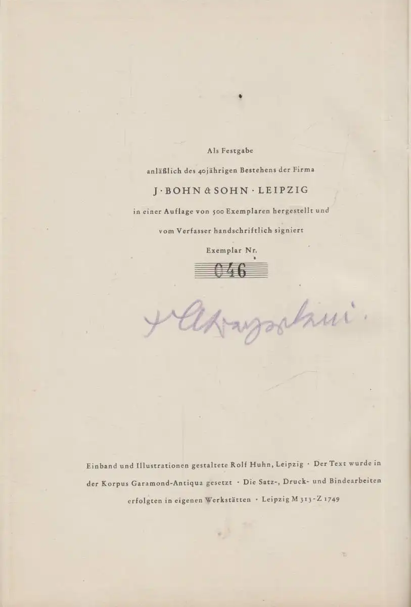 Bemerkungen: Zustand: Einband etwas berieben, Ecken leicht bestoßen, Papier minimal gebräunt // Als Festgabe anlässlich des 40-jähringen Bestehens der Firma J. Bohn & Sohn in einer Auflage von 5000 Exemplaren hergestellt und vom Verfasser signiert, Exemplar Nr. 46. Mit Illustrationen von Rolf Huhn.