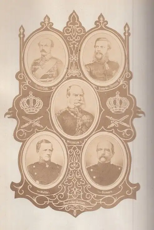 Bemerkungen: Zustand: Der Einband etwas berieben und mit winzigen Fehlstellen am Vorderdeckel, die Vorsätze materialbedingt an den Gelenken leicht geschwärzt, die ersten Seiten einschließlich des Titels und des Seidenhemdches der Tafelseite mit den Porträts von Wilhelm I, dem Kronprinz von Preussen, Moltke, Bismarck u. Prinz Fr. Carl leicht stockig, ansonsten der Buchblock minimal gebräunt , aber sauber // Mit Frontispiz ( 5 Porträtdarstellungen). Herausgegeben von Carl Forger. Noch zum Titel: - nebst einer kurzen Einleitung über die Entstehung des Krieges