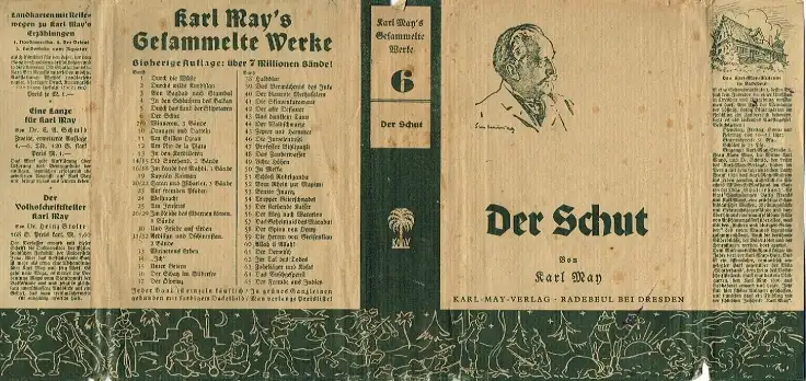 Bemerkungen: Zustand: Schutzumschlag mit Randläsuren, innen an der Unterkante mit transparentem Klebeband verstärkt, Umschlag etwas gebräunt und leicht berieben; illustrierter Leineneinband leicht berieben. Aus Sammlerhaushalt, gut erhalten // Karl May's Gesammelte Werke 6. Fehsenfeld & Co. / Text in Fraktur. Ohne Angabe zum Erscheinungsjahr