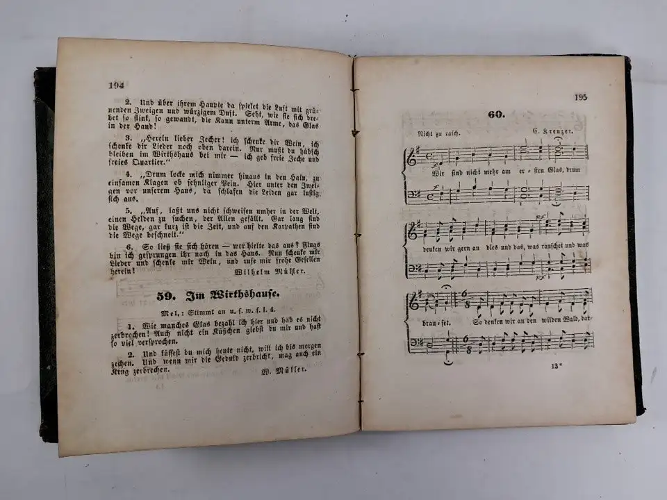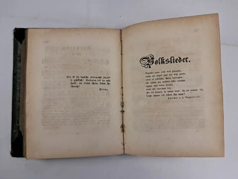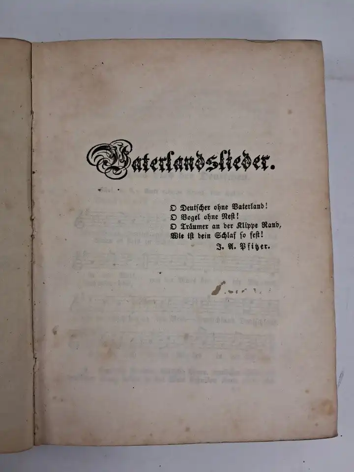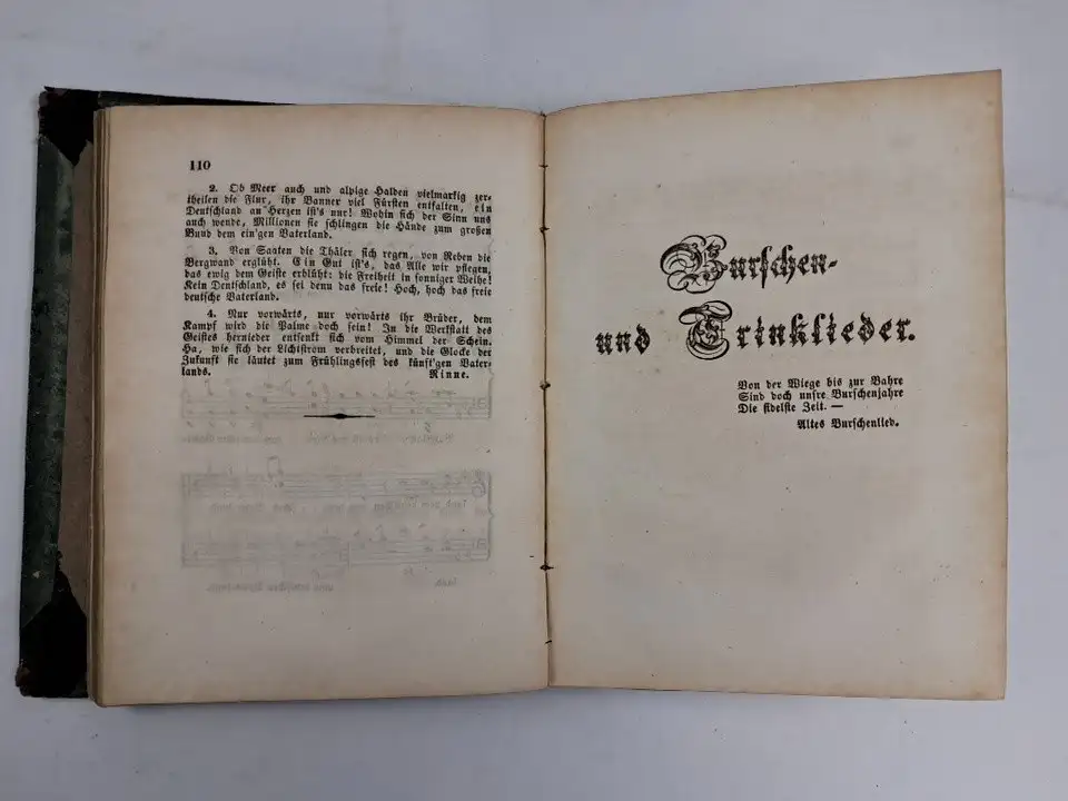 Bemerkungen: Zustand: Einband etwas berieben, Ecken etwas bestoßen, vorderer Rückenfalz eingerissen, Decke vom Block getrennt, Titelblatt fehlt // Enthält: I. Vaterlandslieder, II. Burschen- und Trinklieder, III. Volkslieder. Mit Noten. Text in Fraktur.