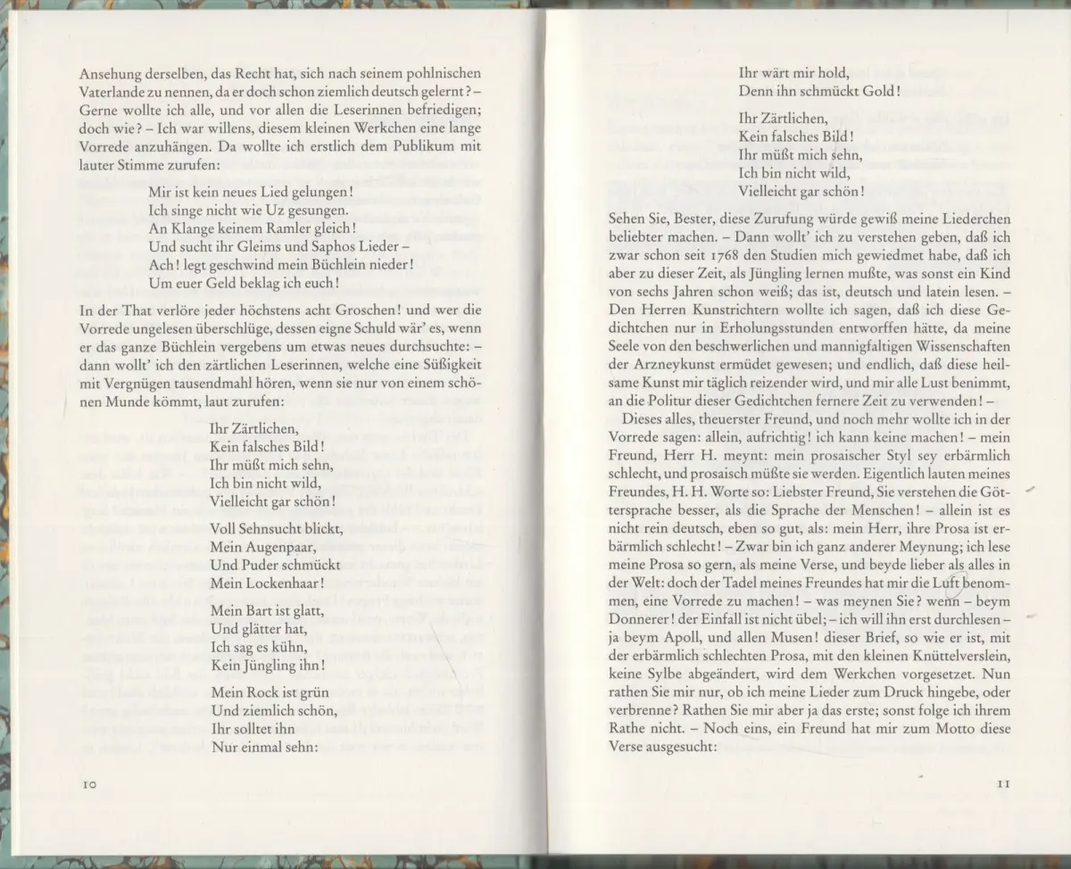 Bemerkungen: Zustand: mit vereinzelten leichten Bleistiftrandanstrichen, sonst sauber & frisch. // Mit einem Nachwort herausgegeben von Andreas Wittbrodt. In dieser Ausgabe wird die erste Lyriksammlung eines Juden in deutscher Sprache nach 230 Jahren zum ersten Mal wieder präsentiert. »Gedichte von einem polnischen Juden« - mit diesem geradezu provokanten Titel spielte 1772 der damals anonyme Autor Isachar Falkensohn Behr mit gängigen Vorurteilen vornehmer Leser und - vor allem - Leserinnen, galten doch die Ostjuden in den deutschen Metropolen als fromme, aber ungebildete, schwarzvermummte Gestalten mit finsterem Blick und bärtigen Gesichtern. Mit dieser Edition wird die erste Lyriksammlung eines deutschsprachigen Juden nachgedruckt - eine Sammlung, die auch Goethes Aufmerksamkeit erregte. Falkensohn Behr, einem Juden aus dem Osten im aufgeklärten Berlin Moses Mendelssohns, gelang es, in seiner Lyrik an deutschen und jüdischen Lebenswelten zugleich teilzuhaben. In der Anakreontik fand der Dichter poetische Formen und Motive und in der Kultur der Freundschaft, die in der Rokoko-Dichtung propagiert wurde, das geeignete Milieu zur Integration..