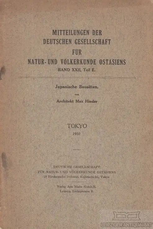 Bemerkungen: Zustand: Die Einbanddecke gebräunt, staubrandig und am Rücken mit Anrissen an beiden Rückenkapitalen sowie rostfleckig an der Klammerung, innen durchgängig an den Heftklammern unschön rostfleckig, dadurch auch beginnende Ablösung des ersten Doppelblattes vor dem Titel, (die Klammern sollten dringend ausgetauscht werden) // Mit 7 Abbildungen auf Tafeln. Herausgegeben von Deutsche Gesellschaft für Natur- und Völkerkunde Ostasiens. Tokyo. - vorderer Spiegel mit schwarzhumorigem Exlibris