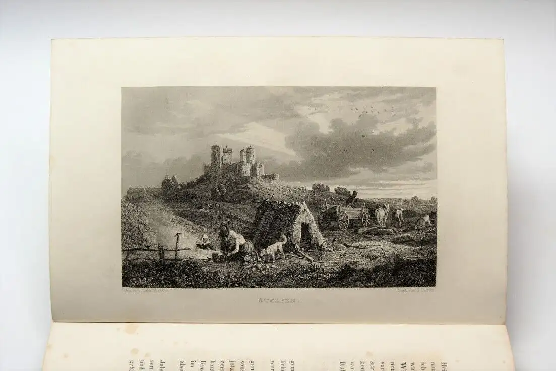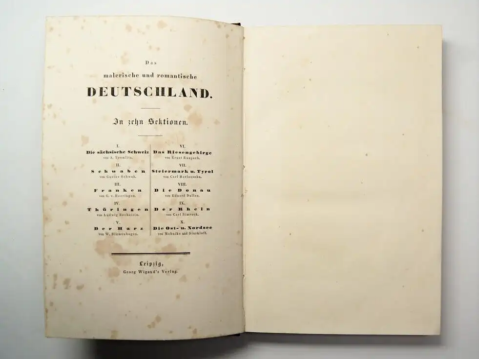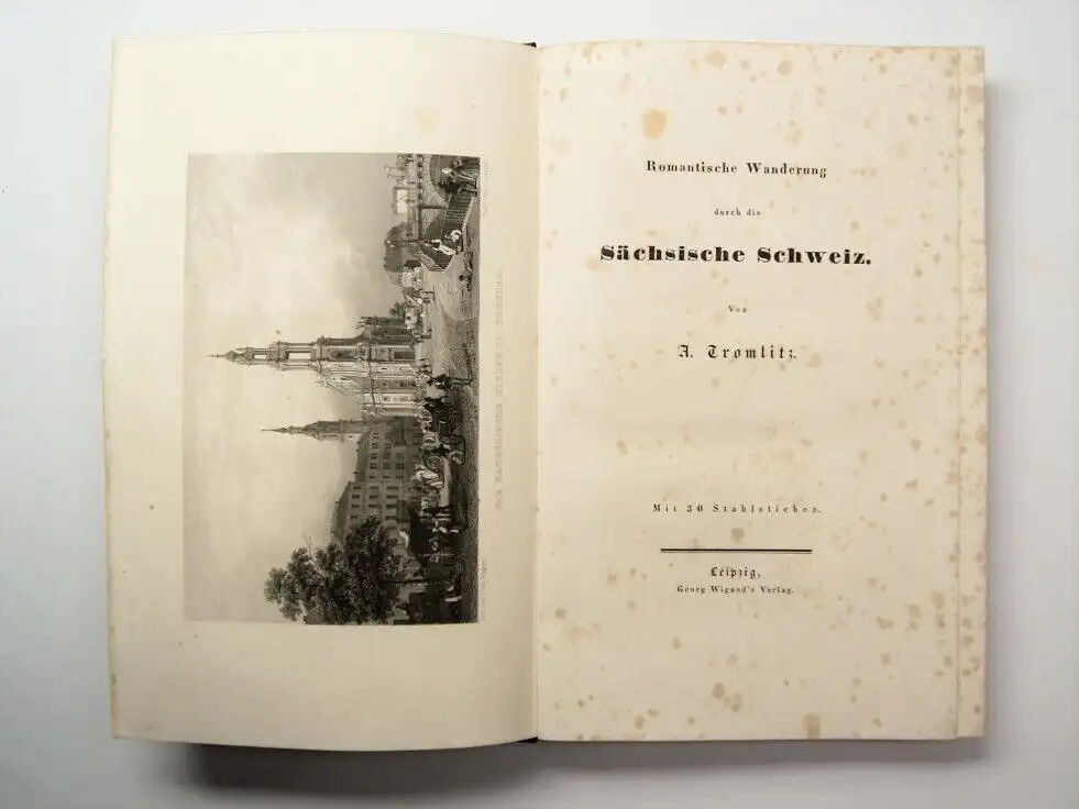 Bemerkungen: Zustand: Buchblock oft etwas braunfleckig, teils stockig, die Stahlstiche oft in den Rändern etwas mitbetroffen, teils auch braunfleckig und mit Abklatsch auf der Textseite // Mit 30 ganzseitigen Stahlstichen. Das malerische und romantische Deutschland 1. Das malerische und romantische Deutschland. In zehn Sektionen, I. Die sächsische Schweiz von A. Tromlitz
