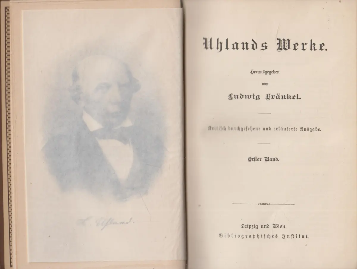 Bemerkungen: Zustand: Einbände etwas berieben, Papier etwas gebräunt // Band 1 mit Frontispiz (Porträtstich Uhlands). Herausgegeben von Ludwig Fränkel. Meyers Klassiker-Ausgaben. Kritisch durchgesehene und erläuterte Ausgabe in zwei Bänden. Text in Fraktur. Ohne Angabe zum Erscheinungsjahr.