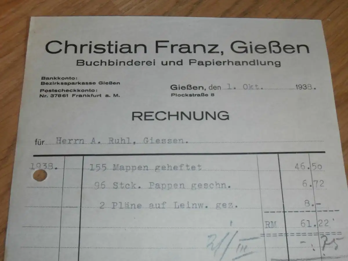 Buchbinderei - Christian Franz in Gießen , 1938 , altes Dokument / Rechnung , Reklame / Werbung , Giessen !!