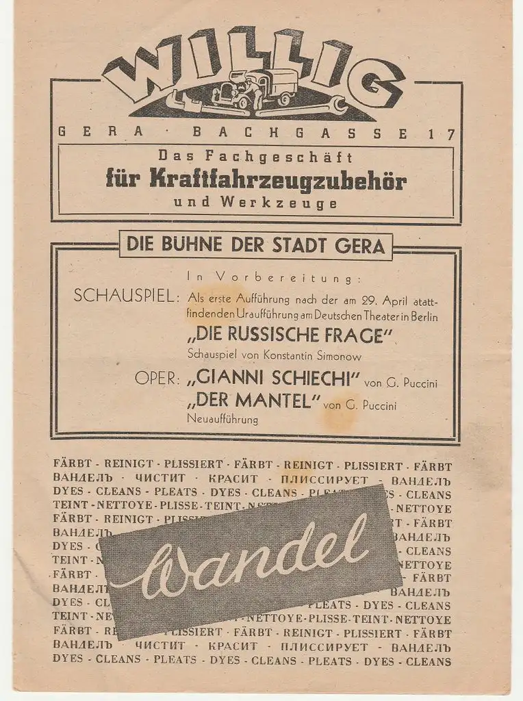 Bühne der Stadt Gera, Walter Brandt: Programmheft A. N. Afinogenow GROSSVATER UND ENKELIN ( Maschenka ) ca. 1946.