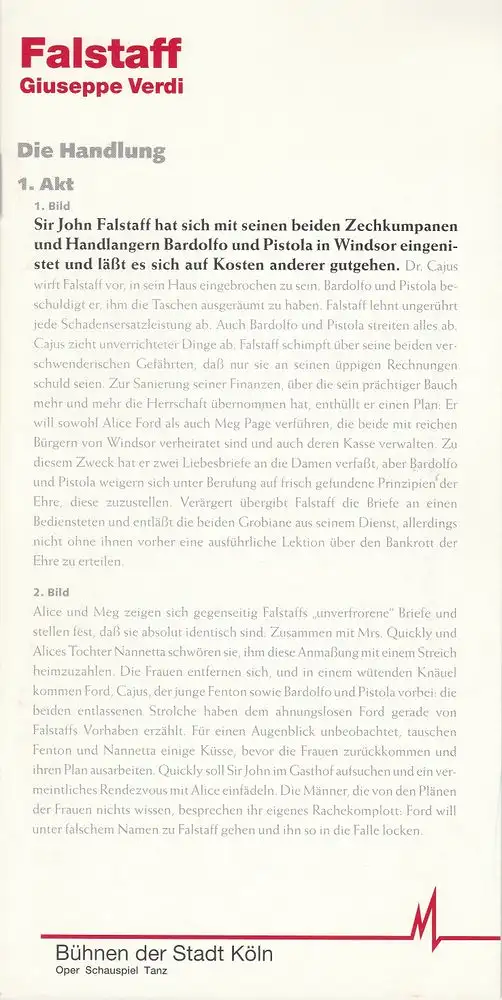 Commedia lirica in drei Akten. Libretto von Arrigo Boito nach William Shakespeare. In italienischer Sprache mit deutschen Übertiteln. Musikalische Leitung: Graeme Jenkins. Inszenierung: Robert Carsen. beiliegende Besetzungsliste. Paul Steinberg. Spielleitung: Martina Pfaff. Mitwirkende: Günter von Kannen, Michael Volle, John Pierce, Jerold Siena, Francis Egerton, u. a. - Theaterprogramm, Opernprogramm, Ballettprogramm, Musicalprogramm, Konzertprogramm, Theatermemorabilia, Programmhefte Sammlung, deutsche Theatergeschichte.