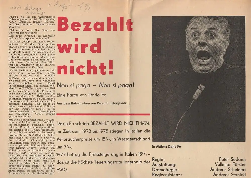 Non si paga- non si Paga! Farce. Aus dem Italienischen von Peter O. Chotjewitz. Regie: Peter Sodann. Ausstattung: Volkmar Förster. Mitwirkende: Christine Krüger, Marina Erdmann, Thomas Thieme, Hilmar Eichhorn, Jochen Nitzel, Jürgen Eilzer, Mario Melzer. - Theaterprogramm, Opernprogramm, Ballettprogramm, Musicalprogramm, Konzertprogramm, Theatermemorabilia, Programmhefte Sammlung, deutsche Theatergeschichte.