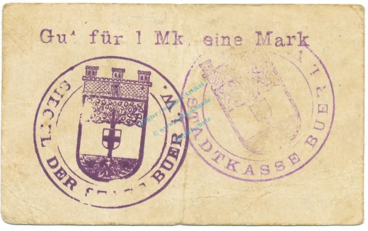 Buer , Notgeld 1 Mark Schein gbr. Diessner 56.5.a , Westfalen o.D. Notgeld 1914-15Gutschein , Notgeld : Stadt Buer , Nicht entwertet