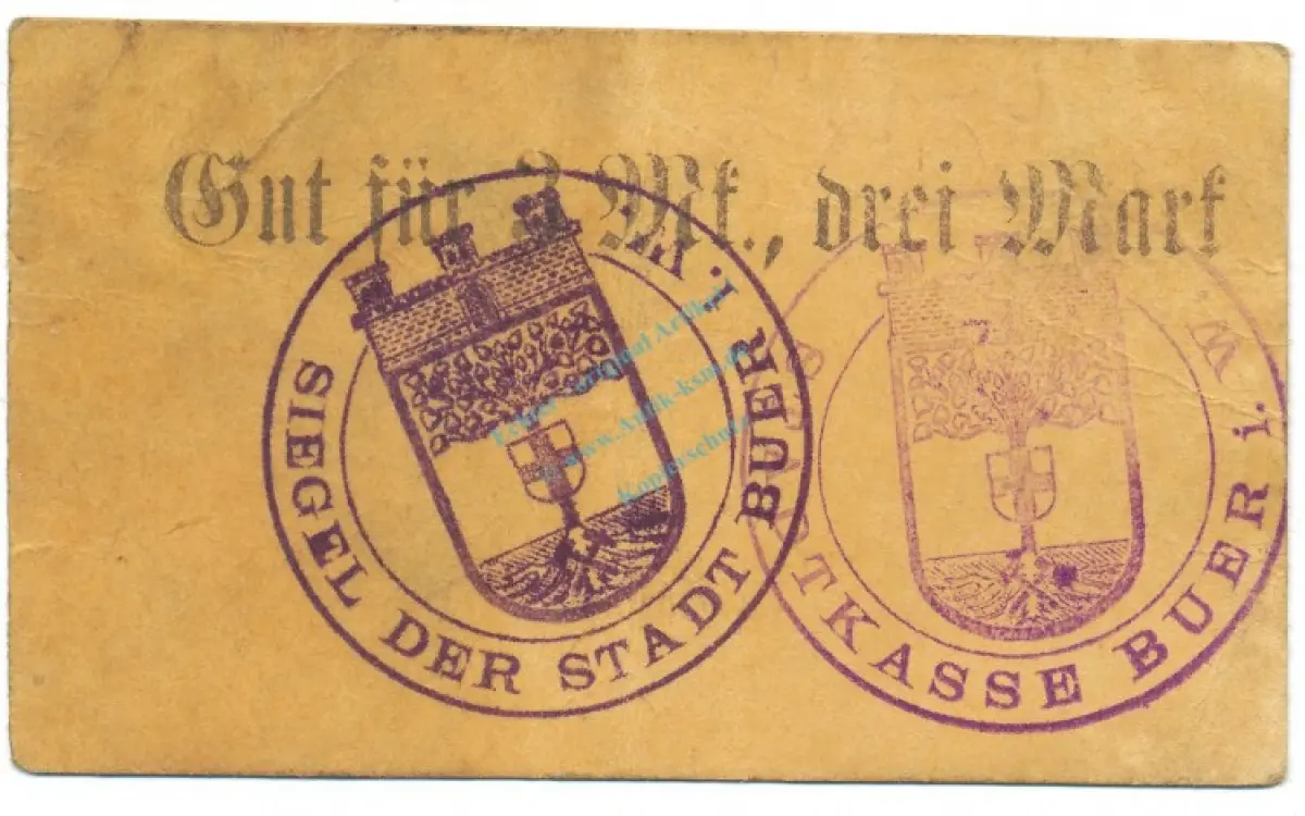 Buer , Notgeld 3 Mark Schein gbr. Diessner 56.1.d , Westfalen o.D. Notgeld 1914-15Gutschein , Notgeld : Stadt Buer , Nicht entwertet