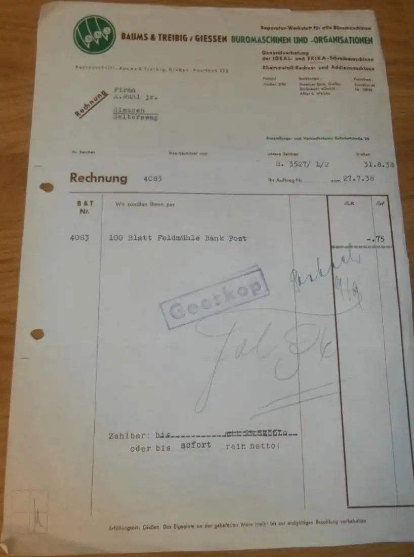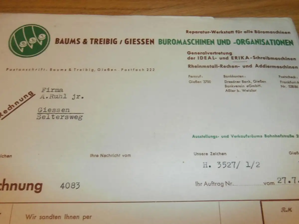 Büromaschinen - Baums & Treibig in Gießen , 1938 , altes Dokument / Rechnung , Reklame / Werbung , Giessen !AZ9-W